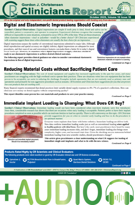 This report provides clinical guidance on when to consider conventional elastomeric impressions in lieu of digital impressions.
