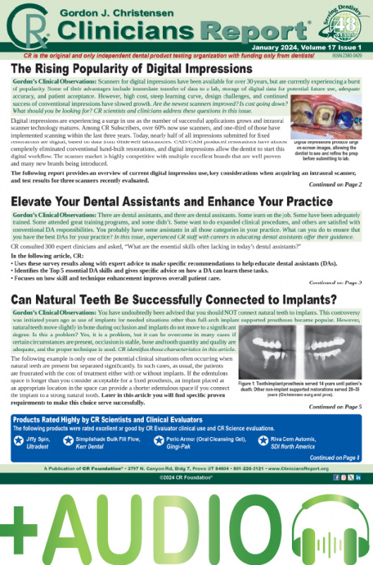 This report provides an overview of current digital impression use, key considerations when acquiring an intraoral scanner, and test results for three scanners recently evaluated.