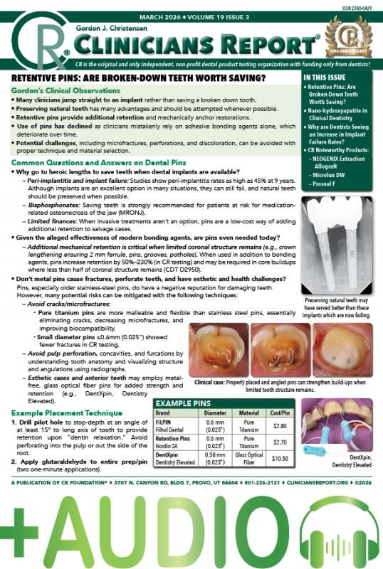 A practical clinical guide to when and how retentive pins can successfully save severely broken-down teeth, reviewing modern materials, technique refinements, and why preserving natural dentition may be preferable to immediate implant placement.