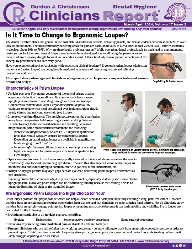 This report shows advantages and limitations of ergonomic prism loupes and compares features of various brands and designs.