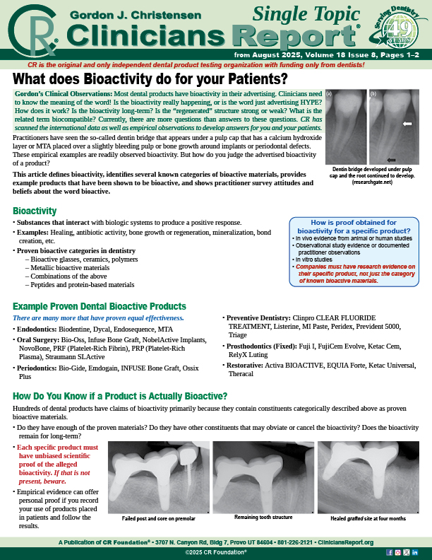 This article defines bioactivity, identifies several known categories of bioactive materials, provides example products that have been shown to be bioactive, and shows practitioner survey attitudes and beliefs about the word bioactive.