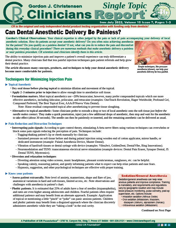 The article discusses many concepts, products, and techniques to help your dental anesthetic delivery become more comfortable for patients.