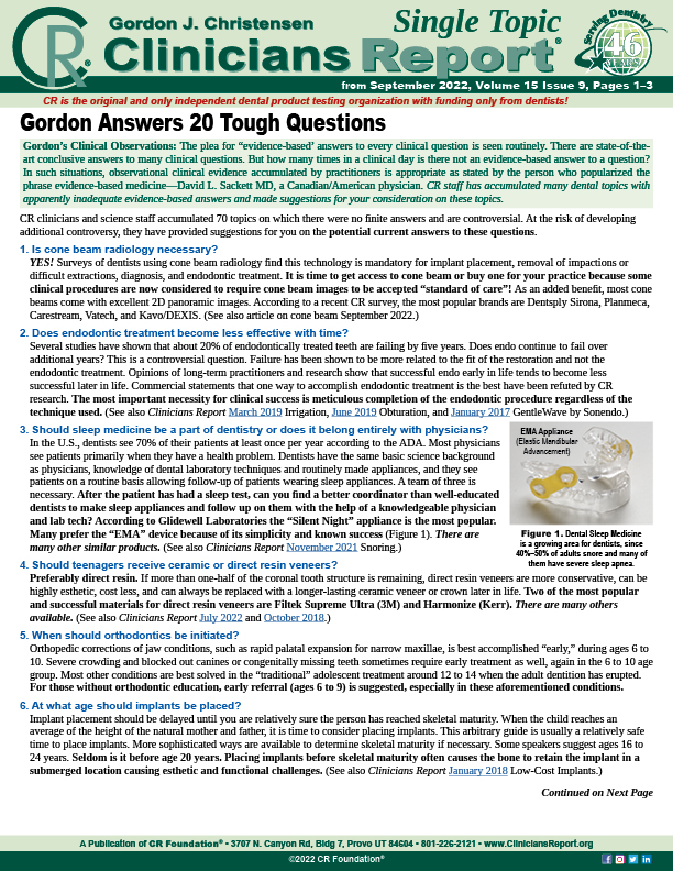 CR clinicians and science staff accumulated 70 topics on which there were no finite answers and are controversial. At the risk of developing additional controversy, they have provided suggestions for you on the potential current answers to these questions.