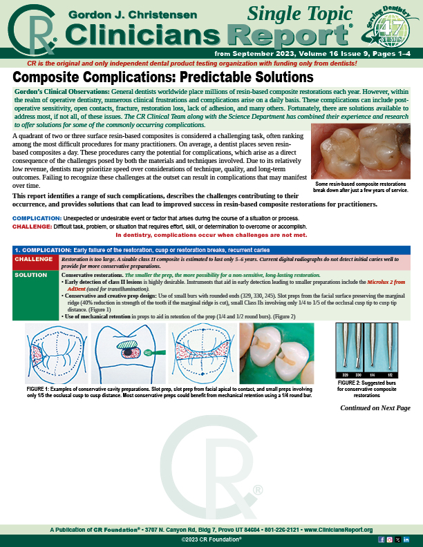 This report identifies a range of such complications, describes the challenges contributing to their occurrence, and provides solutions that can lead to improved success in resin-based composite restorations for practitioners.