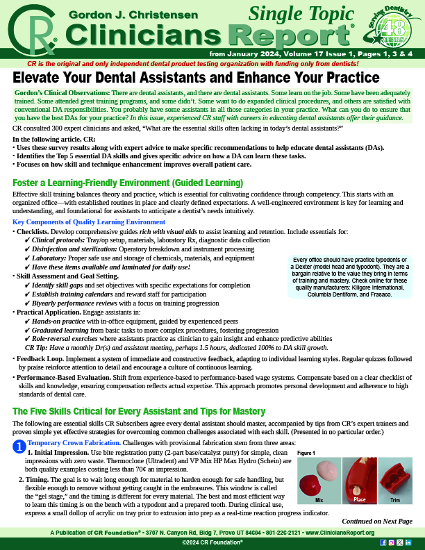 In this article, CR uses survey results along with expert advice to make specific recommendations to help educate dental assistants (DAs); identifies the Top 5 essential DA skills and gives specific advice on how a DA can learn these tasks; and focuses on how skill and technique enhancement improves overall patient care.