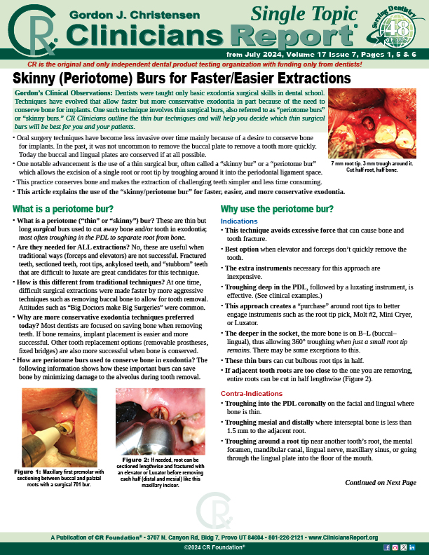 This article explains the use of the “skinny/periotome bur” for faster, easier, and more conservative exodontia.