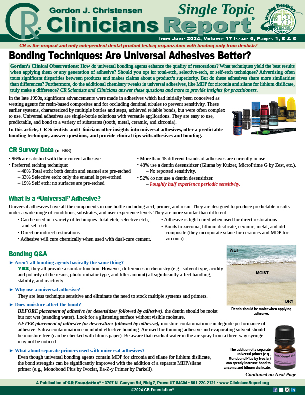 In this article, CR Scientists and Clinicians offer insights into universal adhesives, offer a predictable bonding technique, answer questions, and provide clinical tips with adhesives and bonding.